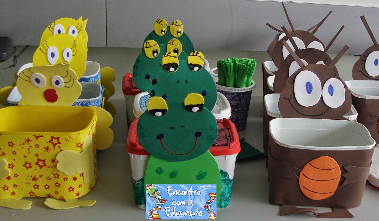 O trabalho foi todo desenvolvido com material reciclado, cola colorida e tinta guache.